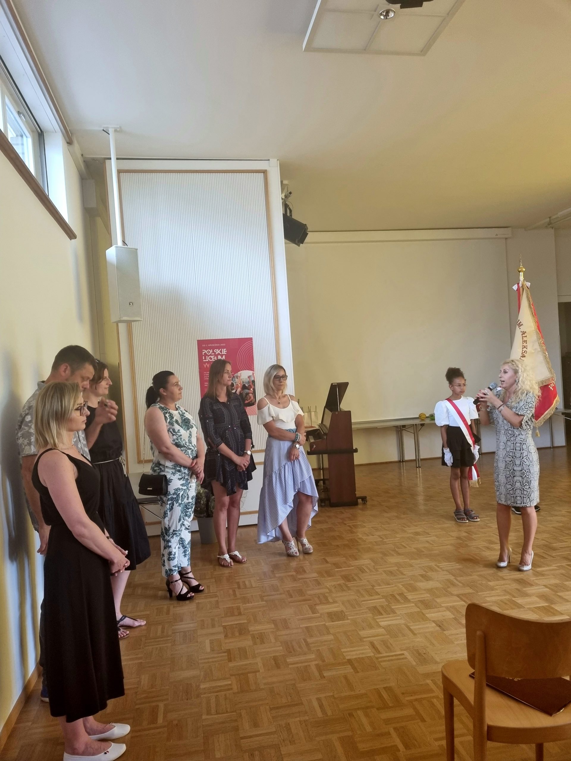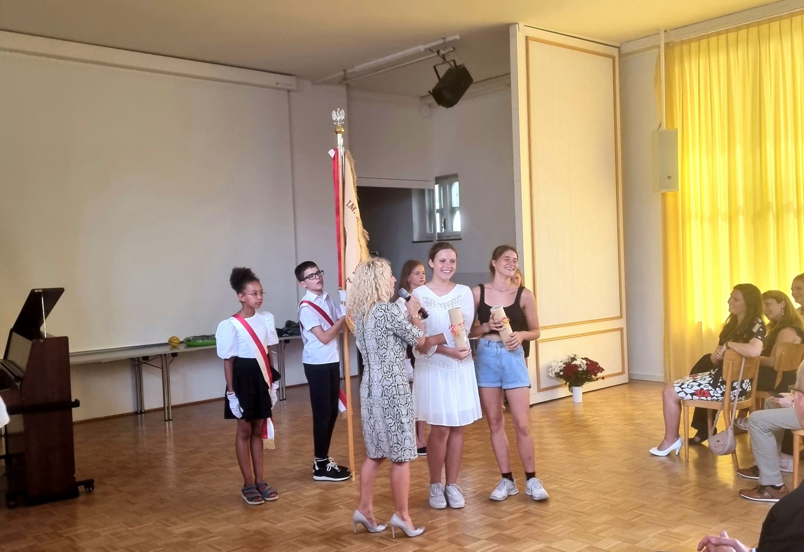 Pani kierownik Sylwia Truszczyńska wyróżniła najlepszych uczniów naszej szkoły, nagrody otrzymali: Zuzanna Perkman, Inga Szczepanik, Lena Bodzioch i Antoni Zdybel. Upominki od Rady Rodziców dostali też uczniowie ósmej klasy, absolwenci szkoły. Były także podziękowania dla Rady Rodziców za ich aktywność na rzecz szkolnej społeczności i wszystkie niespodzianki organizowane dla dzieci. Podsumowano również akcję pomocy dla Ukrainy, dotkniętej wojną, którą prowadziliśmy w naszej szkole. Głos zabrał też Konsul RP pan Marek Głuszko, który podziękował uczniom za rok nauki oraz odczytał list od Ambasador RP pani Iwony Kozłowskiej.