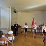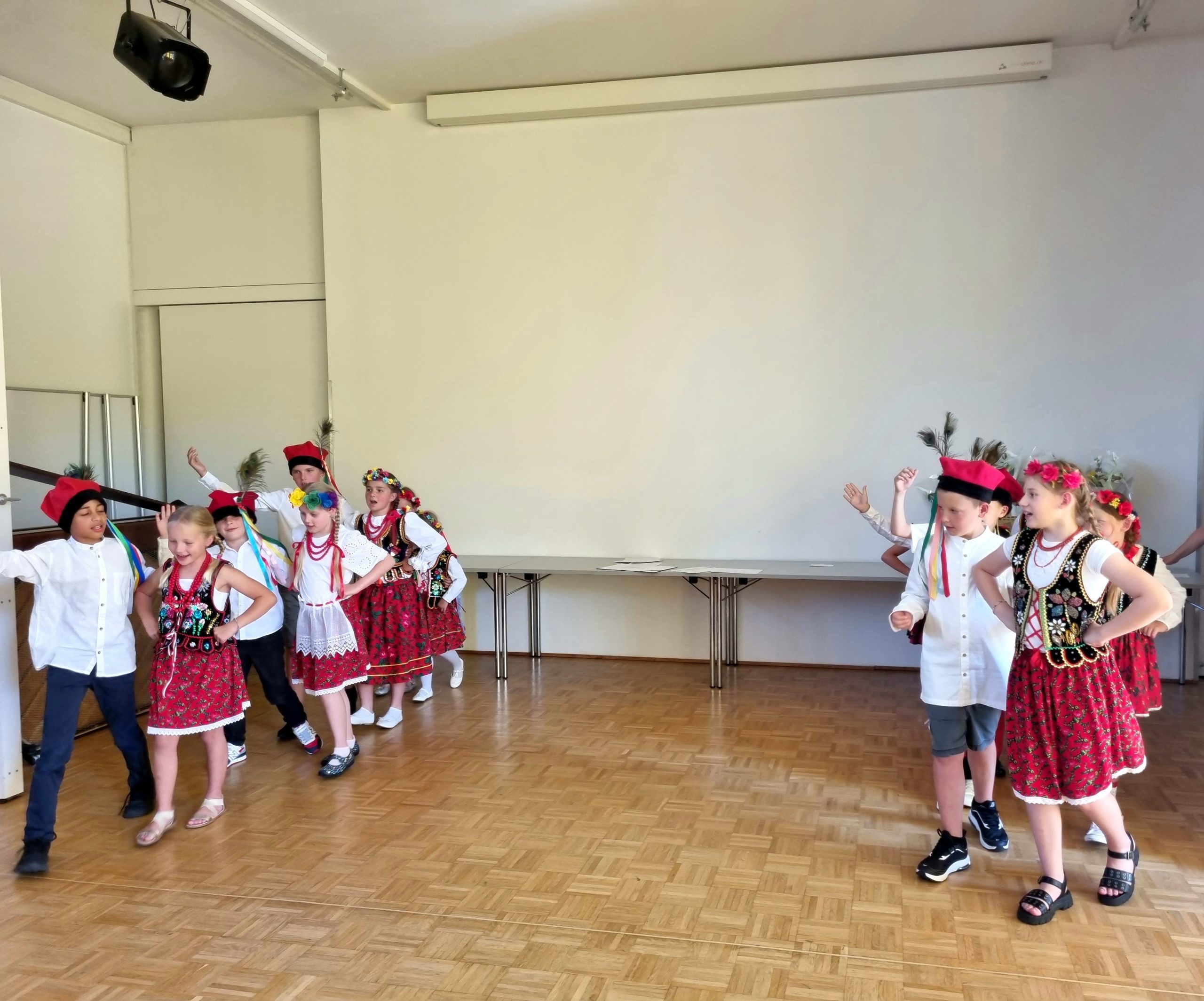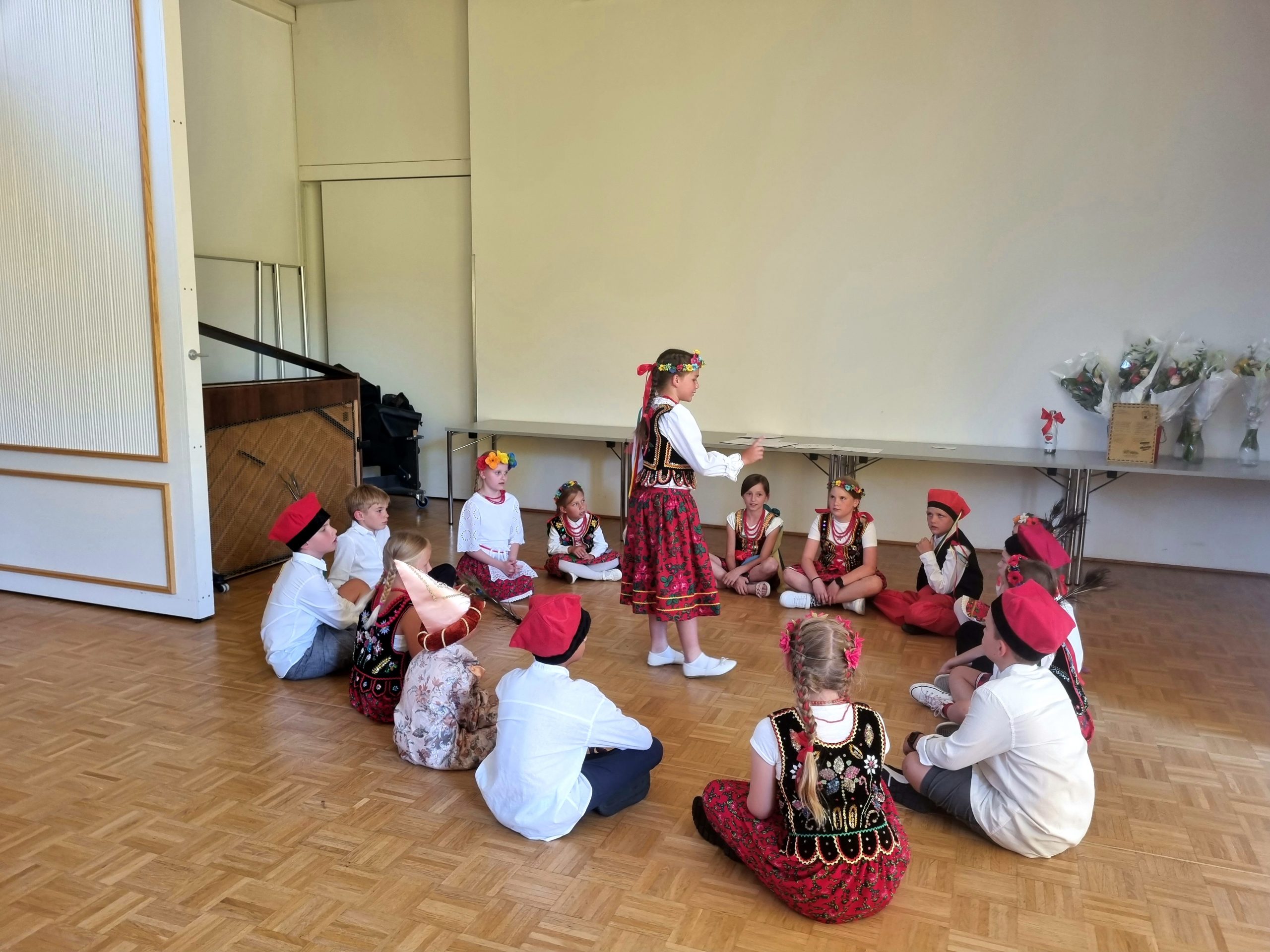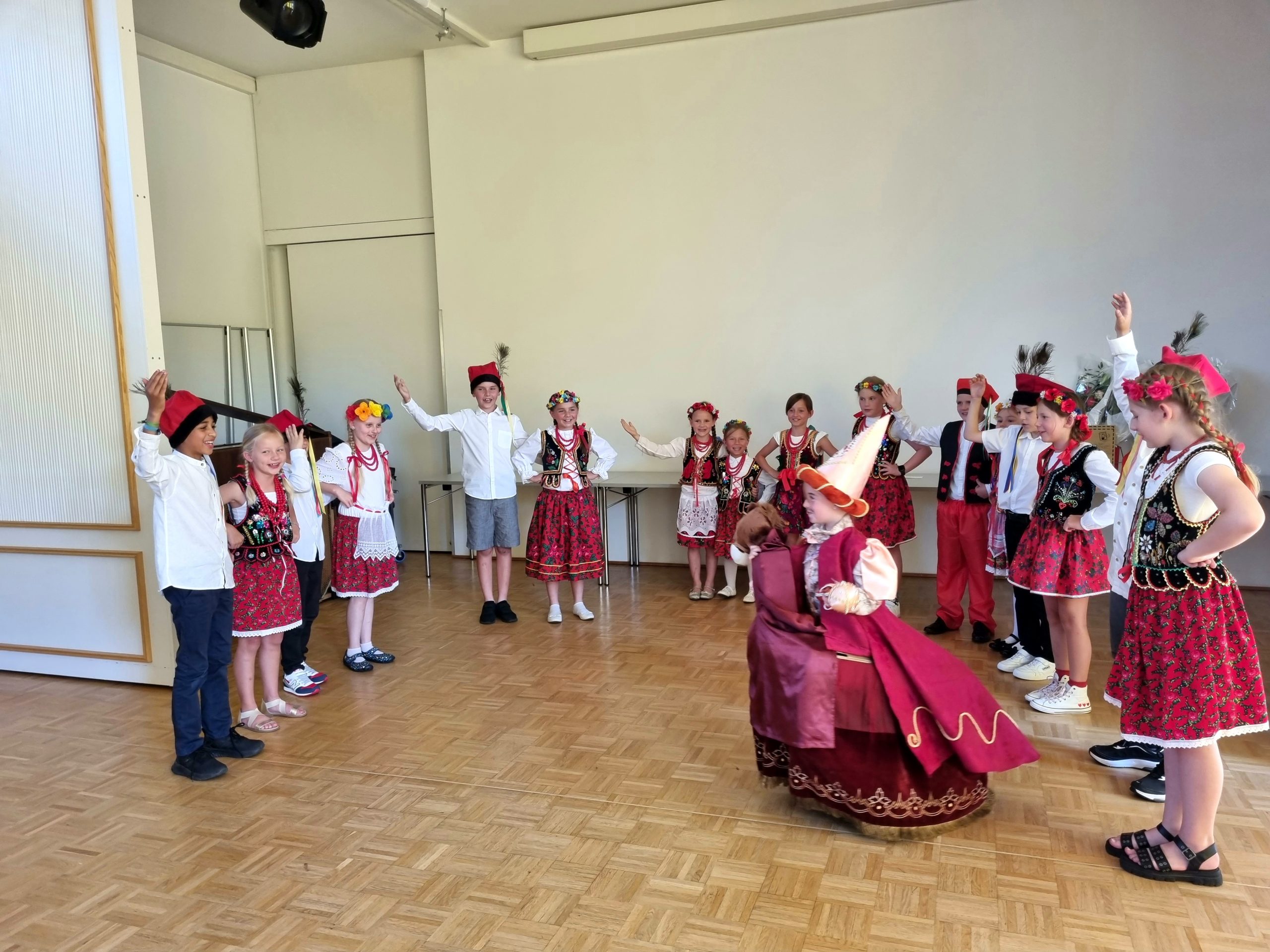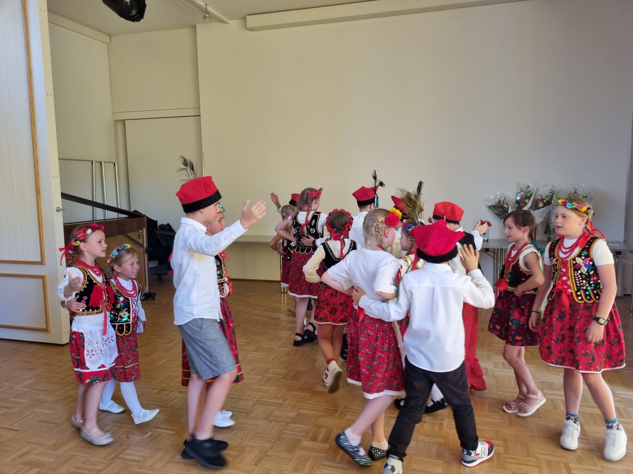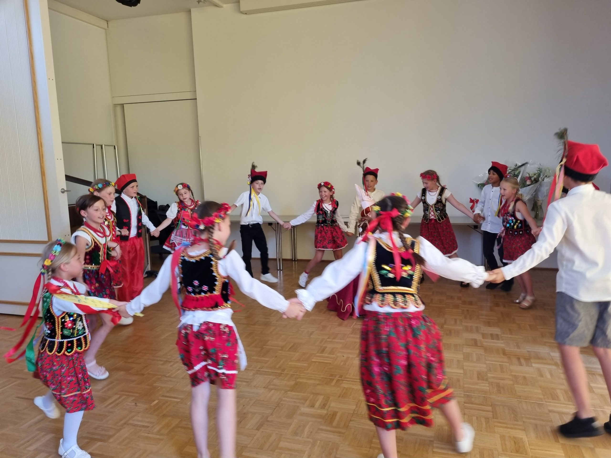 Na koniec wystąpił zespół ludowy „Dziatki”, prowadzony przez Panią Beatę Srokę-Barette, a wszyscy uczniowie odśpiewali hymn szkoły „Kocham Cię Polsko” przy akompaniamencie Pana Marcina Łonaka.