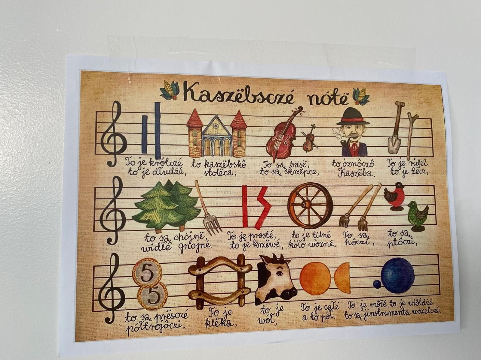 Nie zabrakło także nauki tradycyjnej kaszubskiej piosenki Kaszubskie nuty (Kaszëbsczé nótë, inne nazwy: Alfabet kaszubski, Abecadło kaszubskie). Pieśń jest wyliczanką, a nieodzowna do jej wykonania jest plansza z rysunkami – równolegle do śpiewanego tekstu jedna osoba wskazuje odpowiedni obrazek na pięciolinii (stąd jedna z używanych nazw: kaszubskie nuty). Śpiewane są kolejno trzy pięciolinie, a po dojściu do końca każdej z nich powraca się w odwrotnej kolejności do początku (w ten sposób z każdą kolejną zwrotką tekst piosenki wydłuża się).