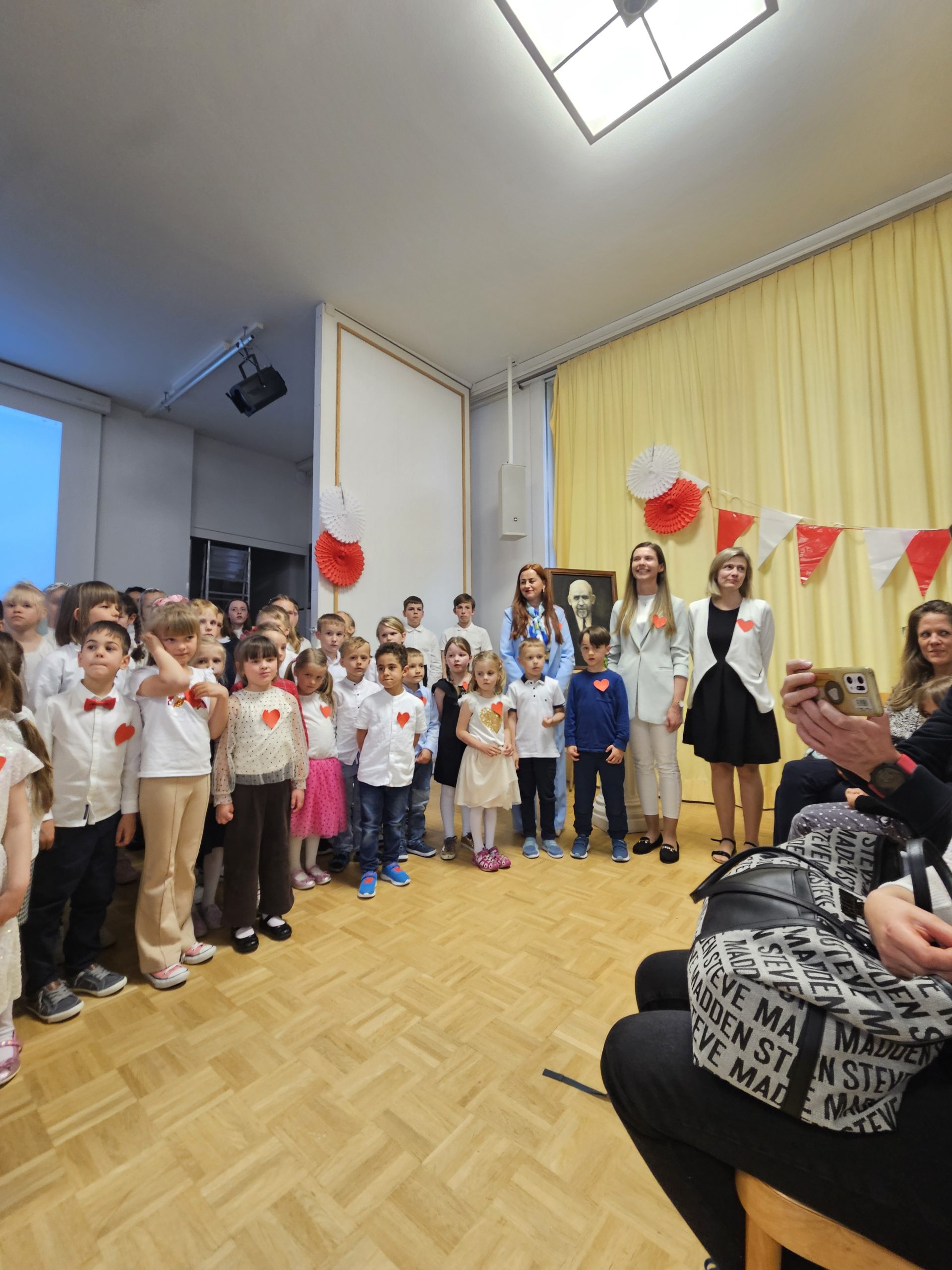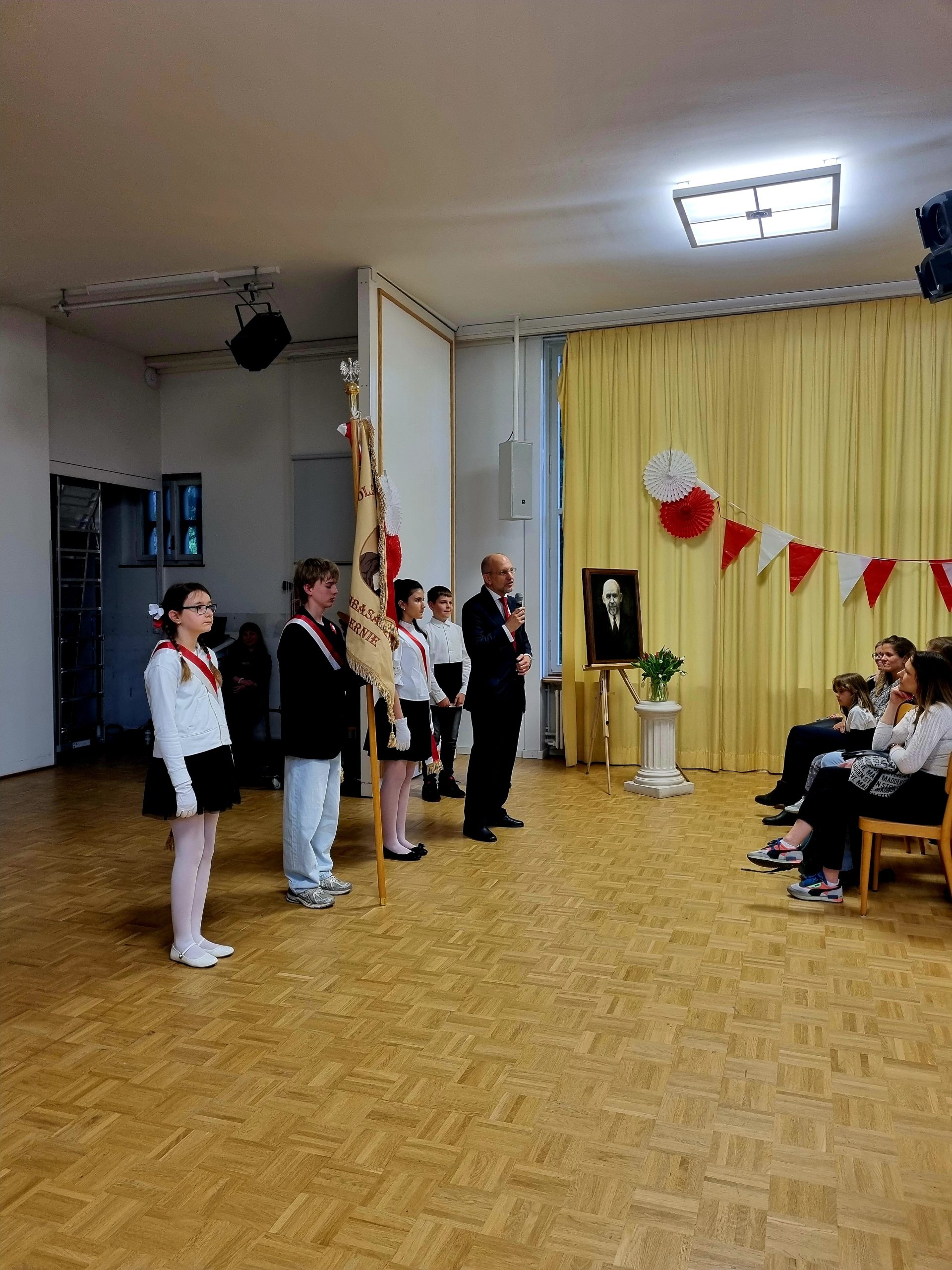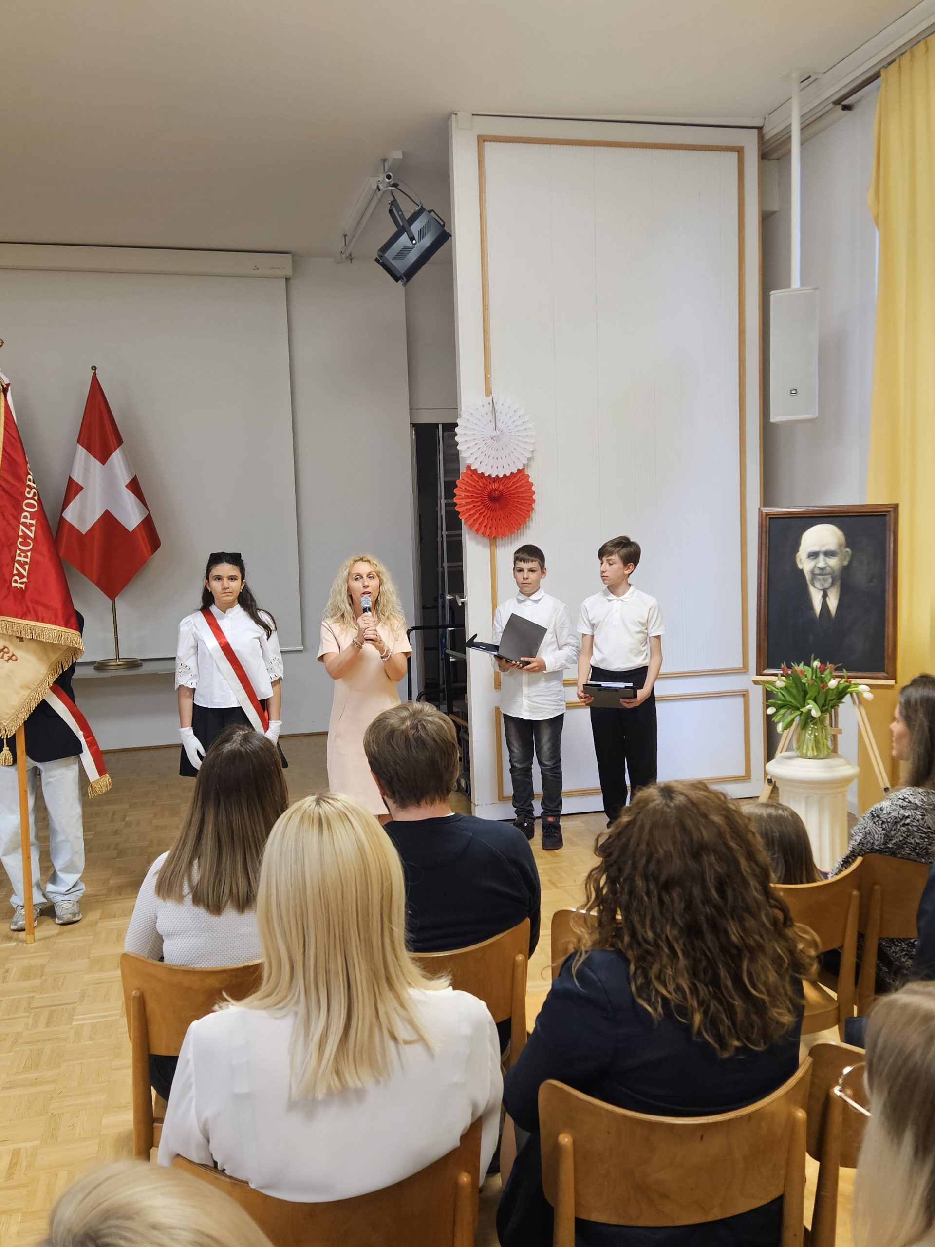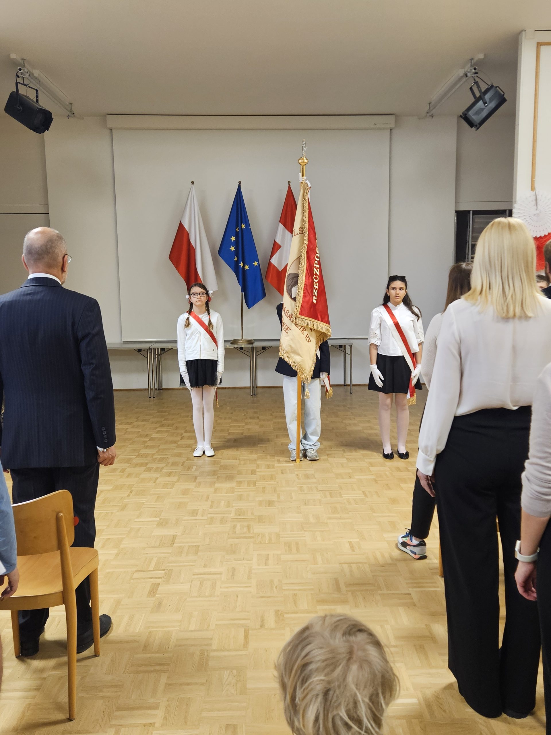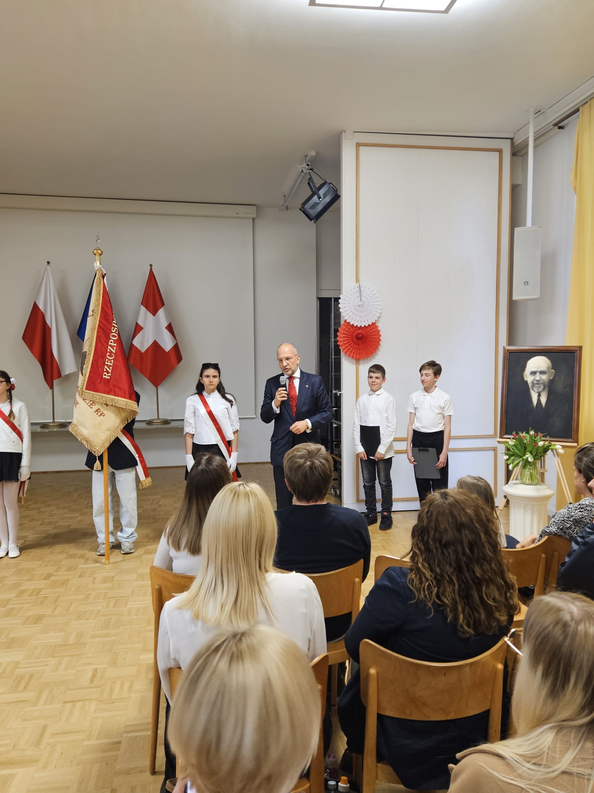W środę 7 maja uczciliśmy majowe święta: Dzień Flagi, Święto Konstytucji 3 Maja oraz 80. rocznicę zakończenia II wojny światowej. Podczas uroczystej akademii mieliśmy zaszczyt gościć Chargé d’affaires a.i. RP Pana Ministra Marka Minarczuka oraz rodziców naszych uczniów.