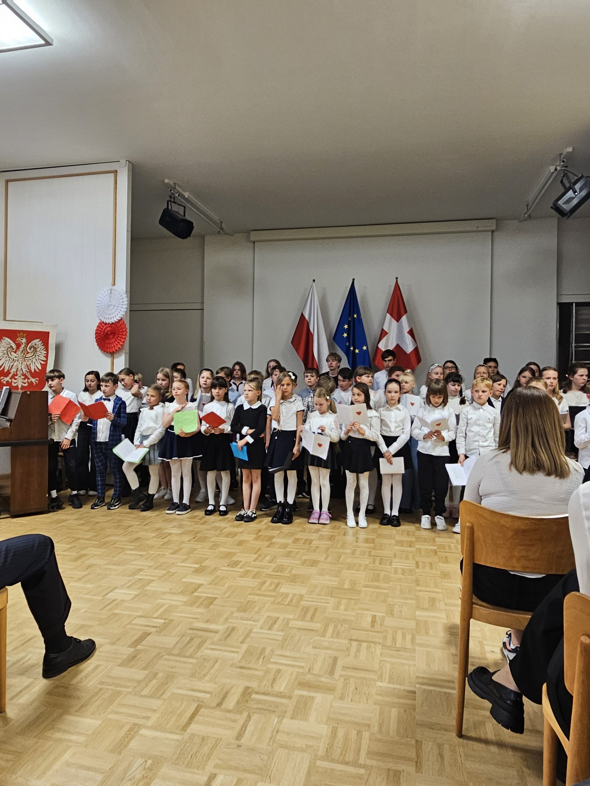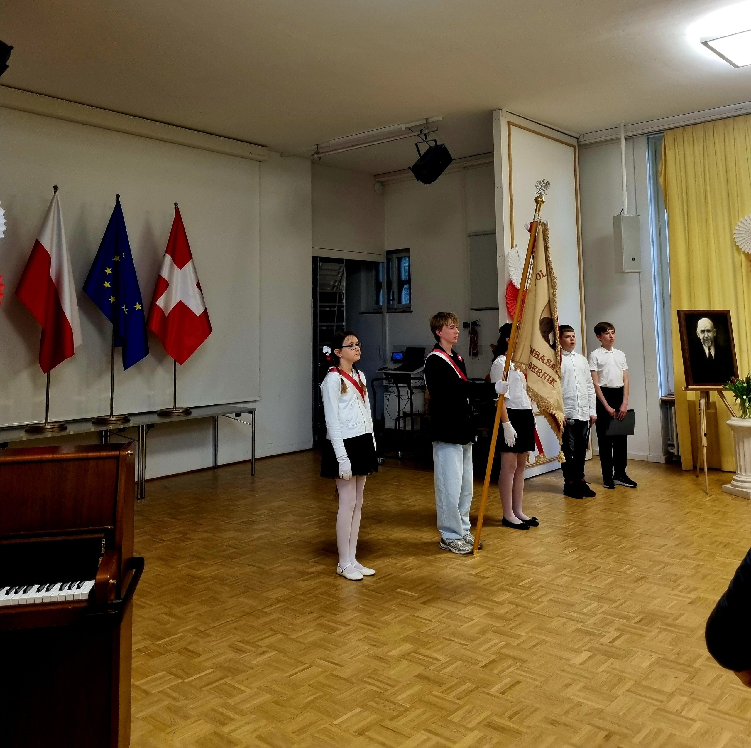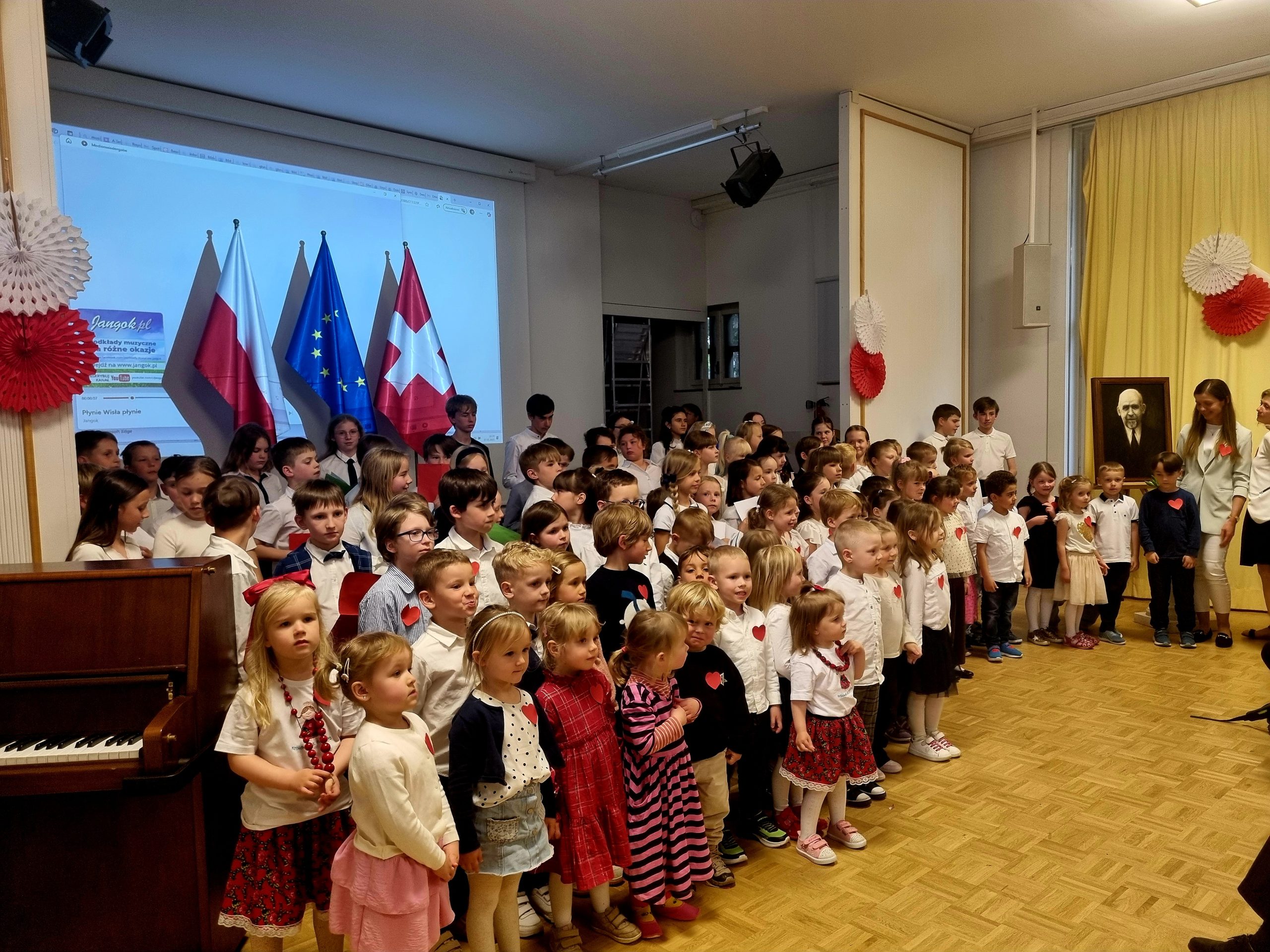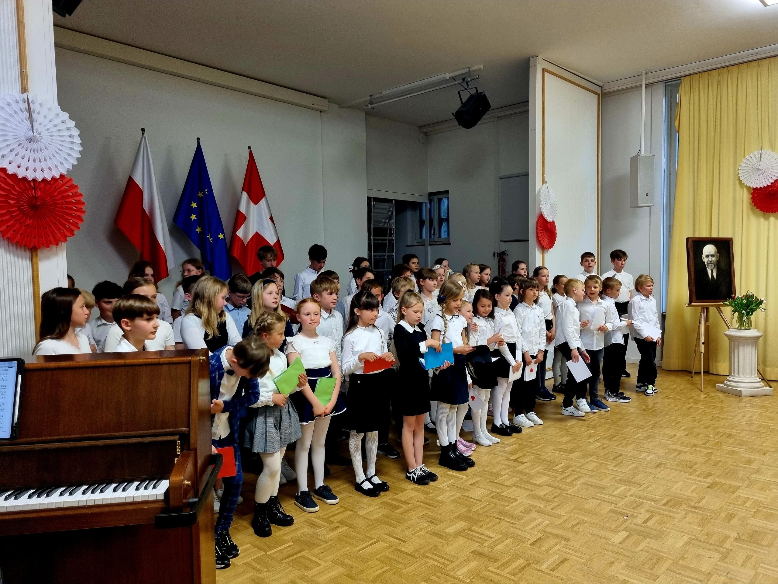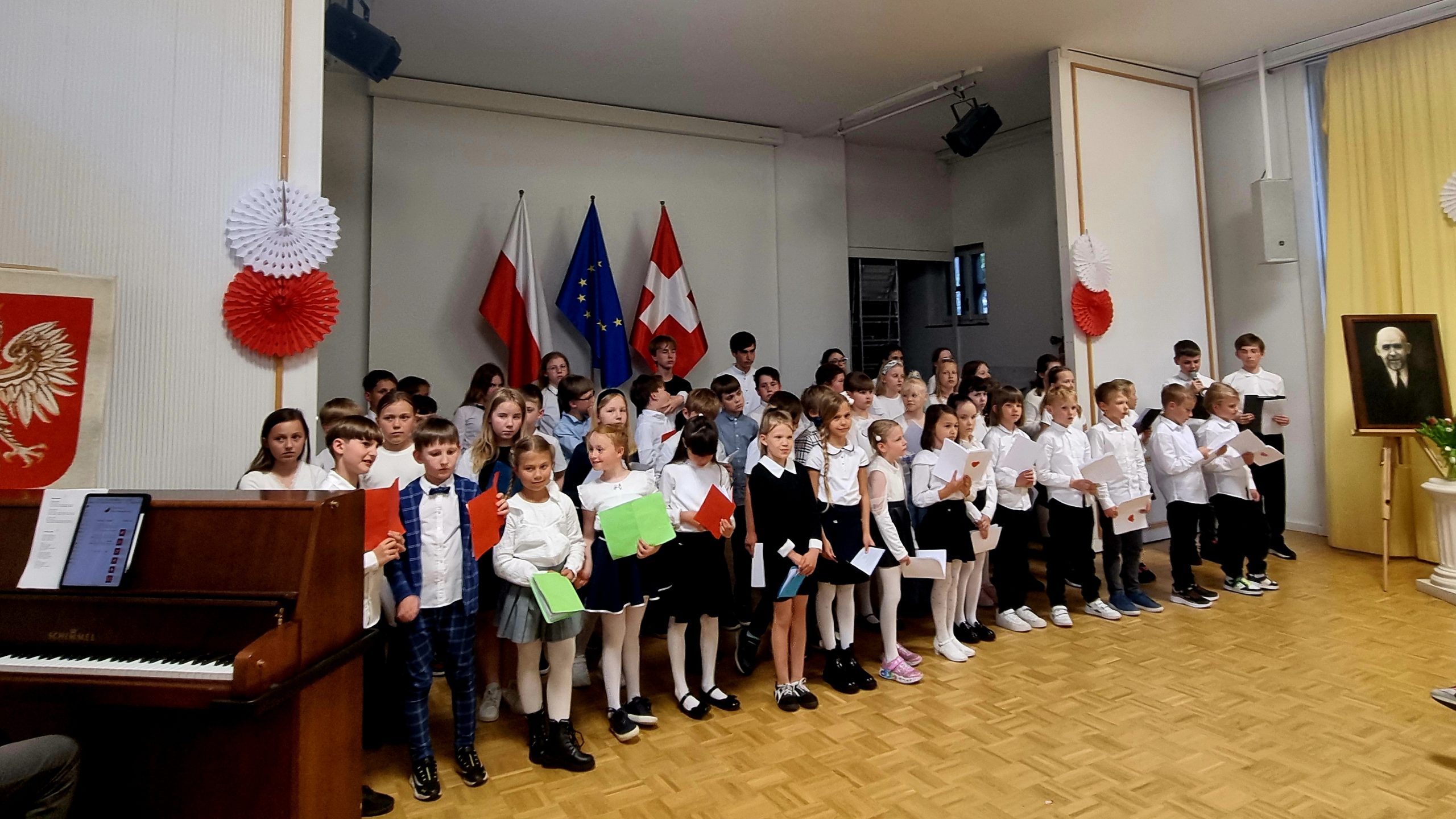 Tym razem przygowaliśmy koncert polskich pieśni i piosenek patriotycznych, przeplatany informacjami o powstaniu i znaczeniu tych utworów w historii Polski.  Zgromadzeni goście mogłi usłyszeć „Witaj majowa jutrzenko”,”Płynie Wisła, płynie”,  „Przybyli ułani”, „Rozmaryn”, „Wojenko, wojenko” „Legiony”, „Białe róże”, „Czerwone maki na Monte Casino” i „Taki kraj”. Dzieciom akompaniował Pan Tomasz Domański, znany polski pianista. A na zakończenie zagrał nasz utalentowany uczeń Jan Łonak. Korzystając z okazji Pani Dyrektor Sylwia Truszczyńska wręczyła Panu Ministrowi Minarczukowi w imieniu Sztabu WOŚP Berno, który działa pod patronatem naszej szkoły, podziękowania za wsparcie 33. Finału Wielkiej Orkiestry Świątecznej Pomocy w Bernie. Po części oficjalnej Rada Rodziców przygotowała słodki poczęstunek.