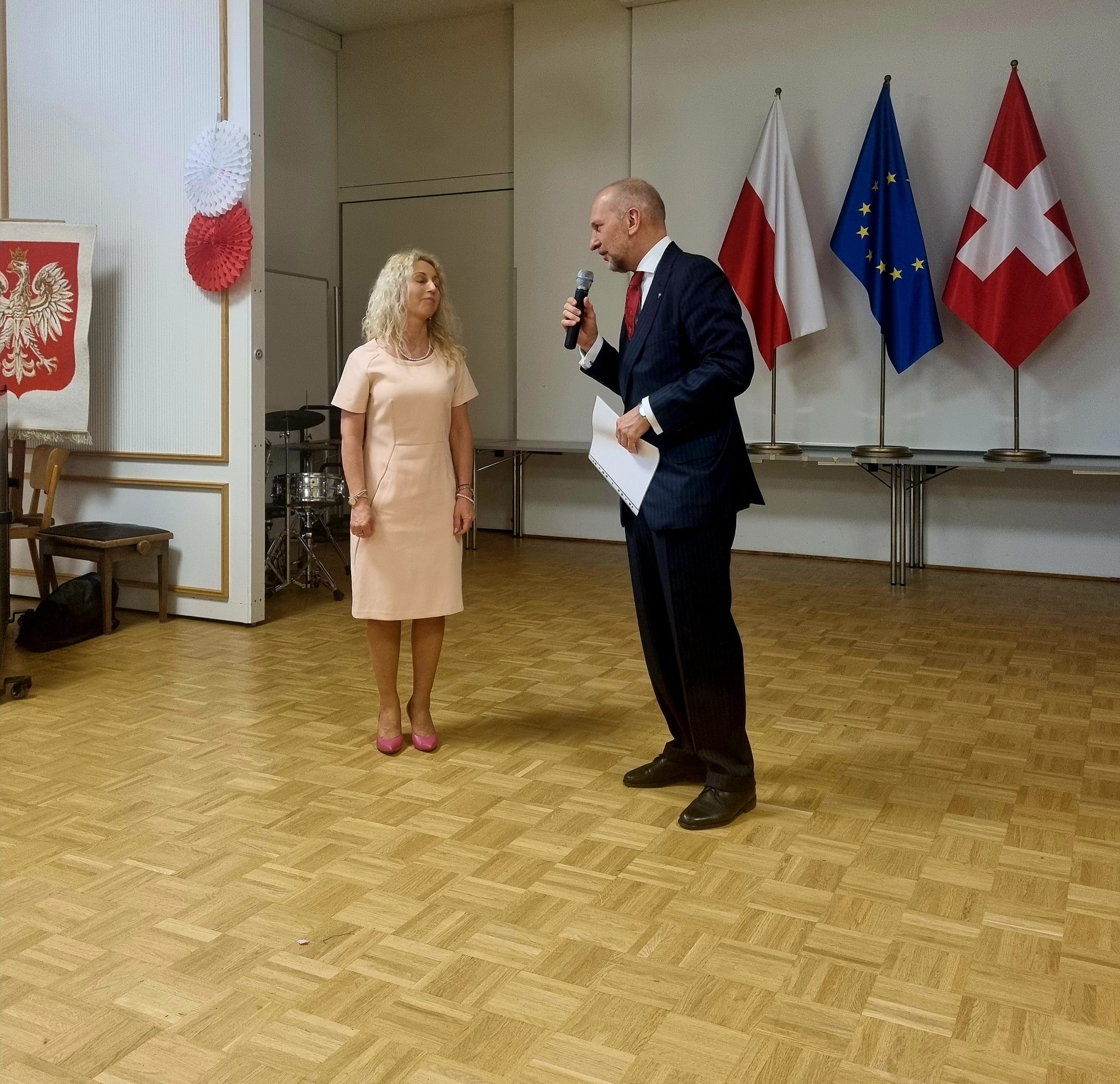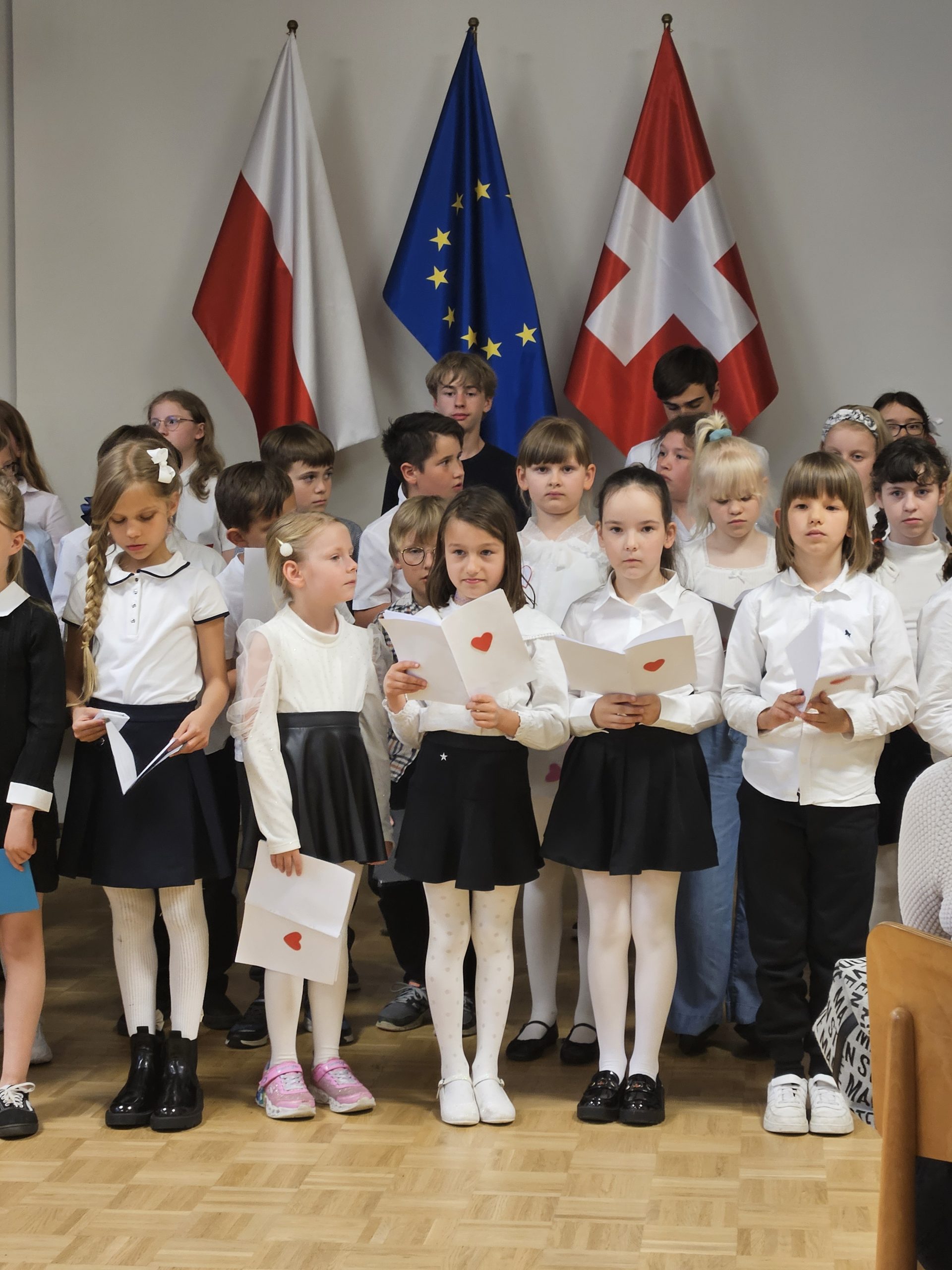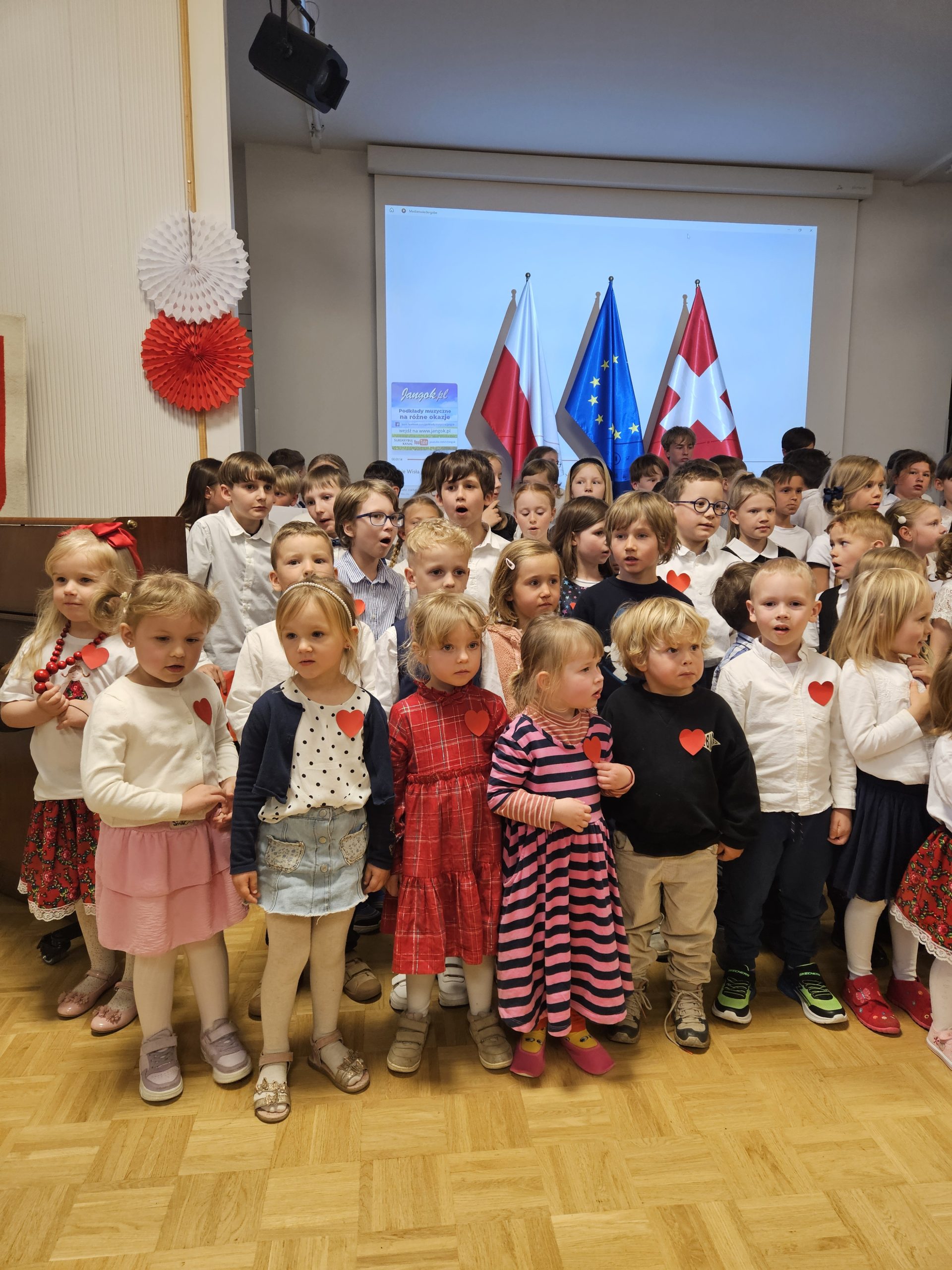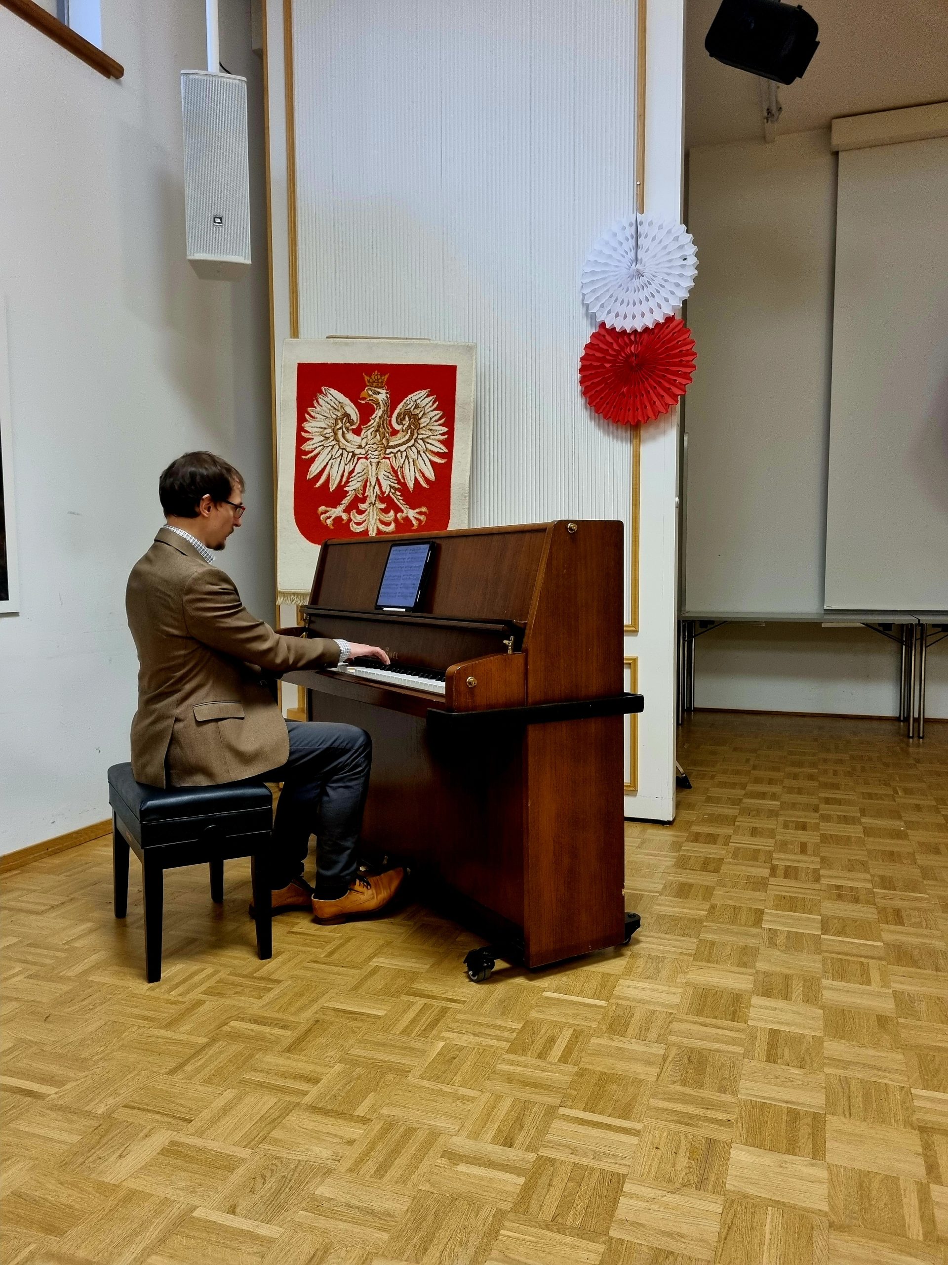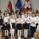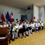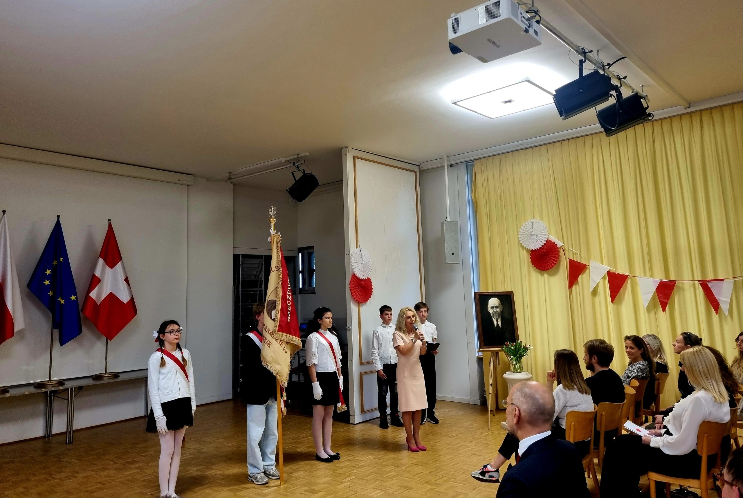 Tym razem przygowaliśmy koncert polskich pieśni i piosenek patriotycznych, przeplatany informacjami o powstaniu i znaczeniu tych utworów w historii Polski.  Zgromadzeni goście mogłi usłyszeć „Witaj majowa jutrzenko”,”Płynie Wisła, płynie”,  „Przybyli ułani”, „Rozmaryn”, „Wojenko, wojenko” „Legiony”, „Białe róże”, „Czerwone maki na Monte Casino” i „Taki kraj”. Dzieciom akompaniował Pan Tomasz Domański, znany polski pianista. A na zakończenie zagrał nasz utalentowany uczeń Jan Łonak. Korzystając z okazji Pani Dyrektor Sylwia Truszczyńska wręczyła Panu Ministrowi Minarczukowi w imieniu Sztabu WOŚP Berno, który działa pod patronatem naszej szkoły, podziękowania za wsparcie 33. Finału Wielkiej Orkiestry Świątecznej Pomocy w Bernie. Po części oficjalnej Rada Rodziców przygotowała słodki poczęstunek.